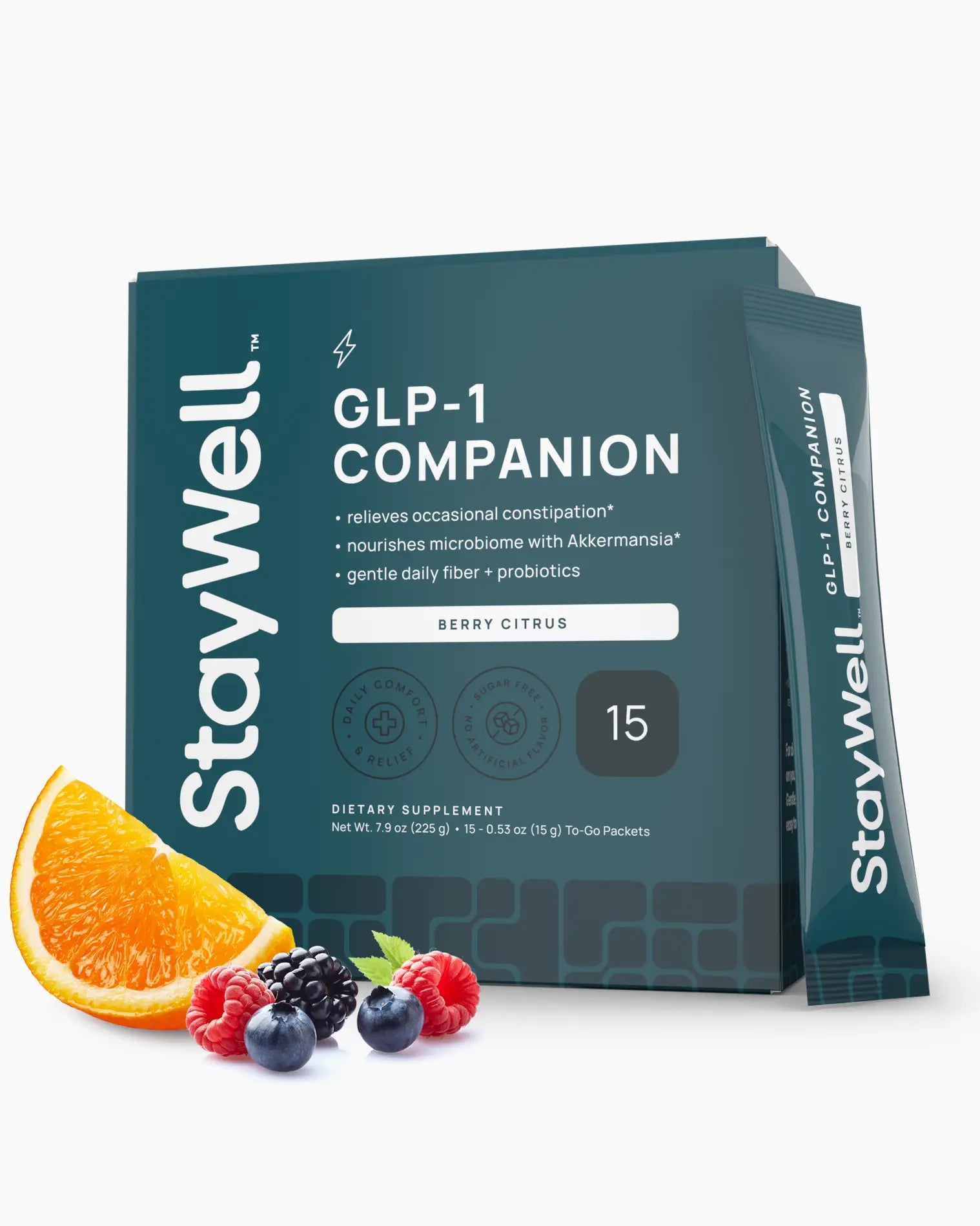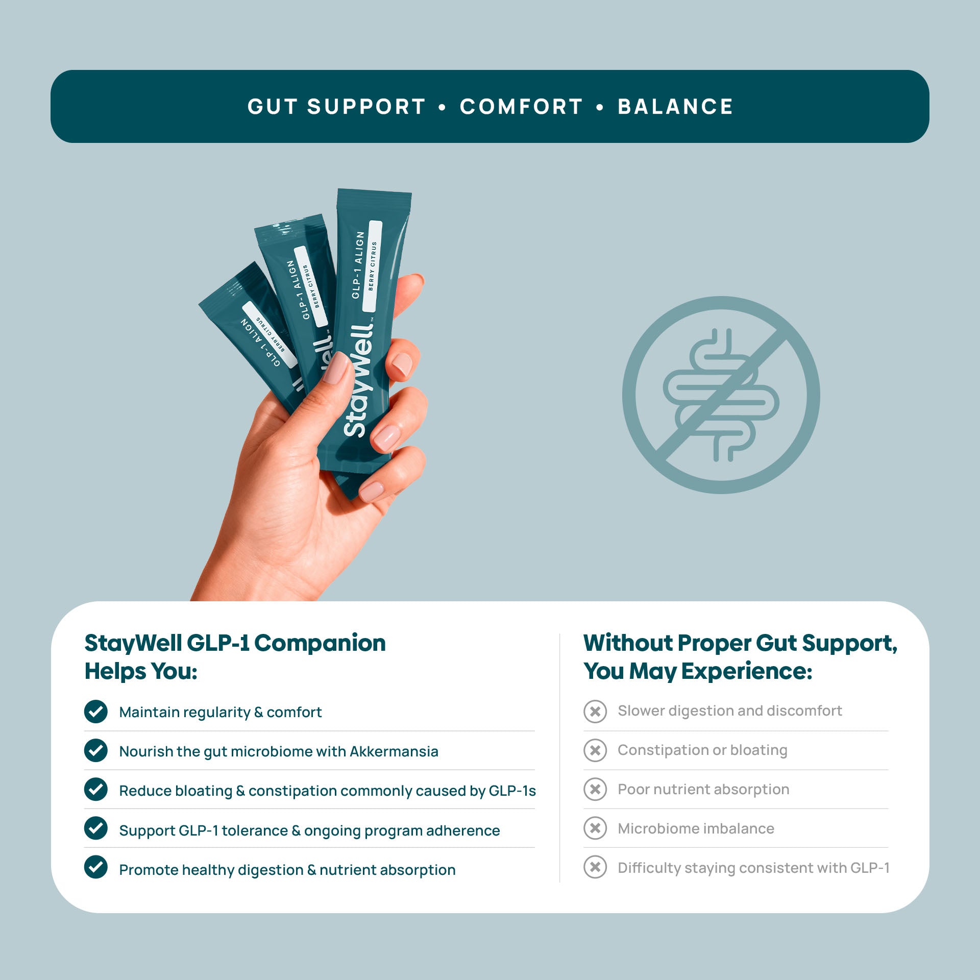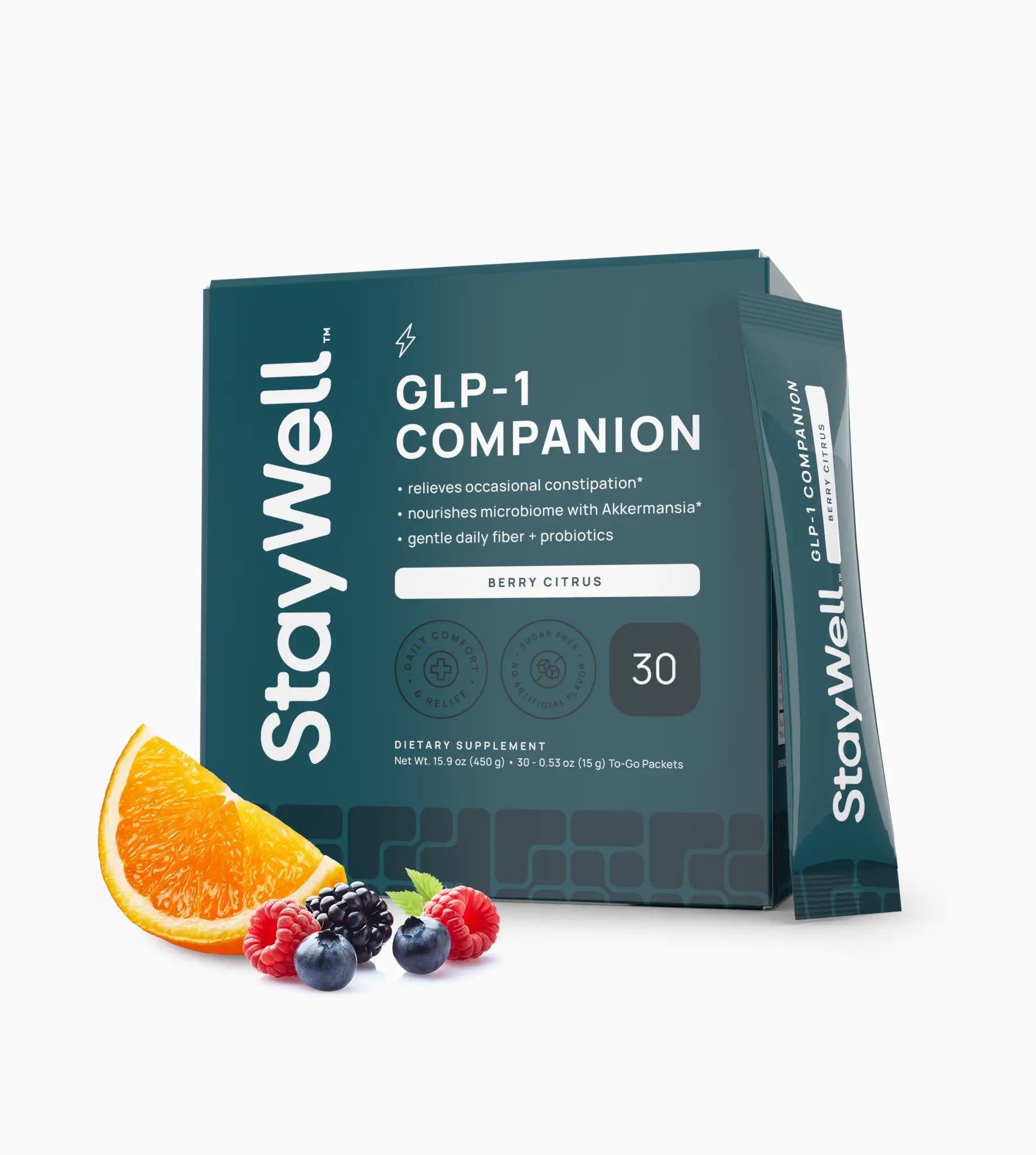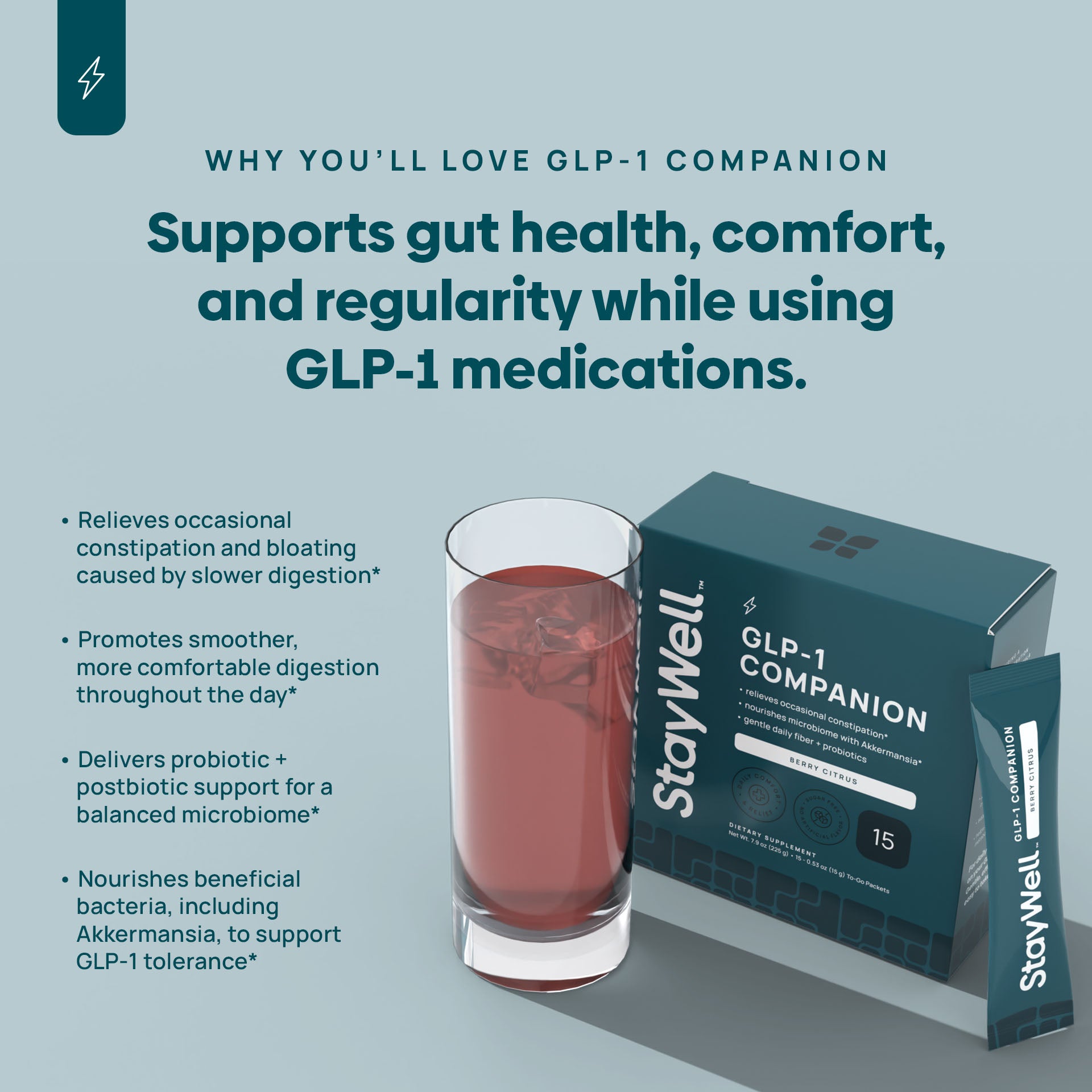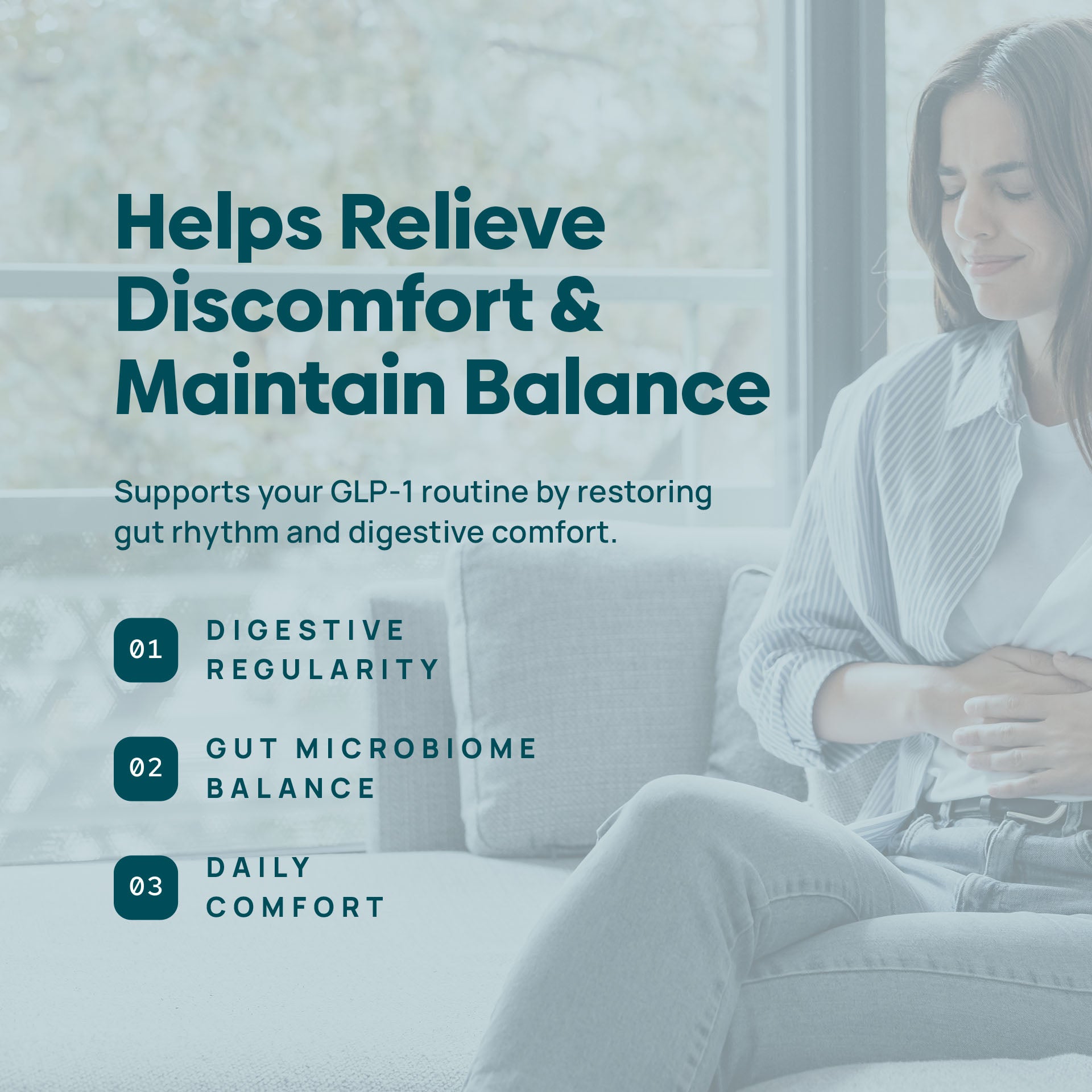 Gut comfort and regularity support designed for people using GLP-1 medications, with probiotic and postbiotic balance.